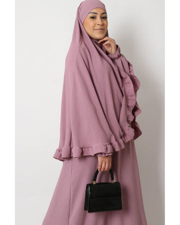 Wunderschönes Abaya-Set mit Puffärmeln. Der Raffhalter Khimar ist wunderschön mit einer Rüschenkante versehen