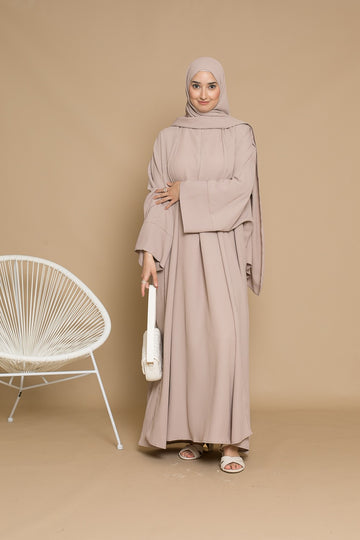 Entworfen aus einem blickdichten Frühlings- und Sommerstoff. Ein ärmelloses Kleid von 143 cm Länge (mit Reißverschluss), ein weiter Kimono und ein flexibler Hijab. 3 Teile, die Sie separat tragen können.