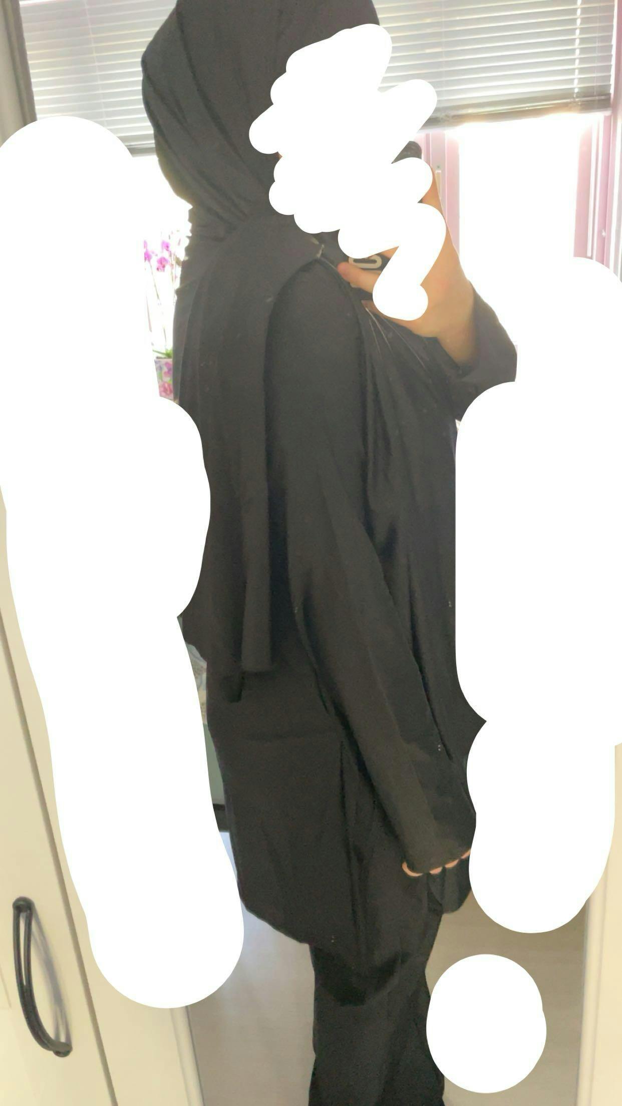 Een wijde tuniek. Wijde broek. Een sportieve hijab om te knopen met tieback. Een riem.