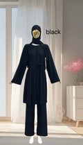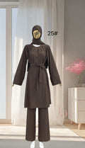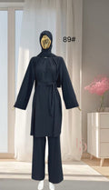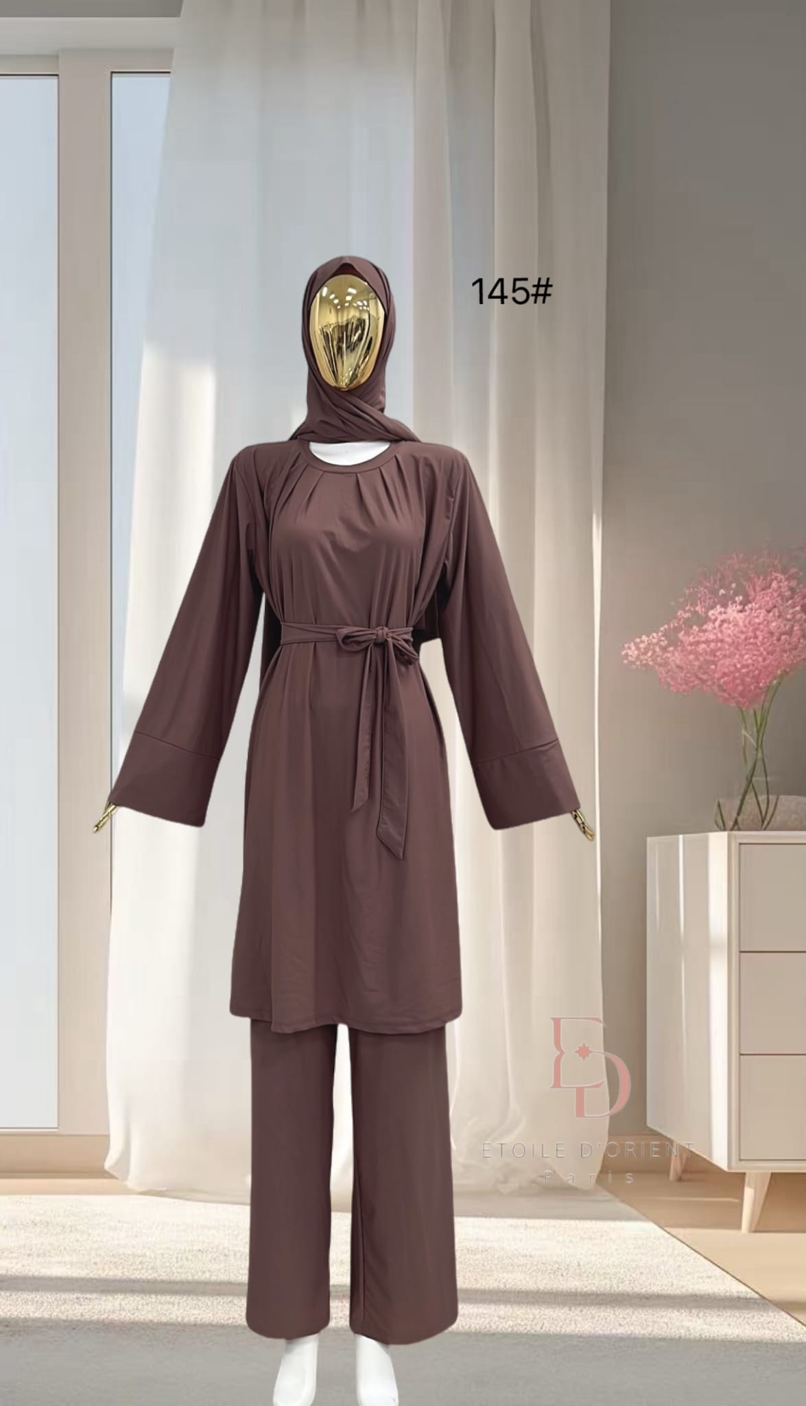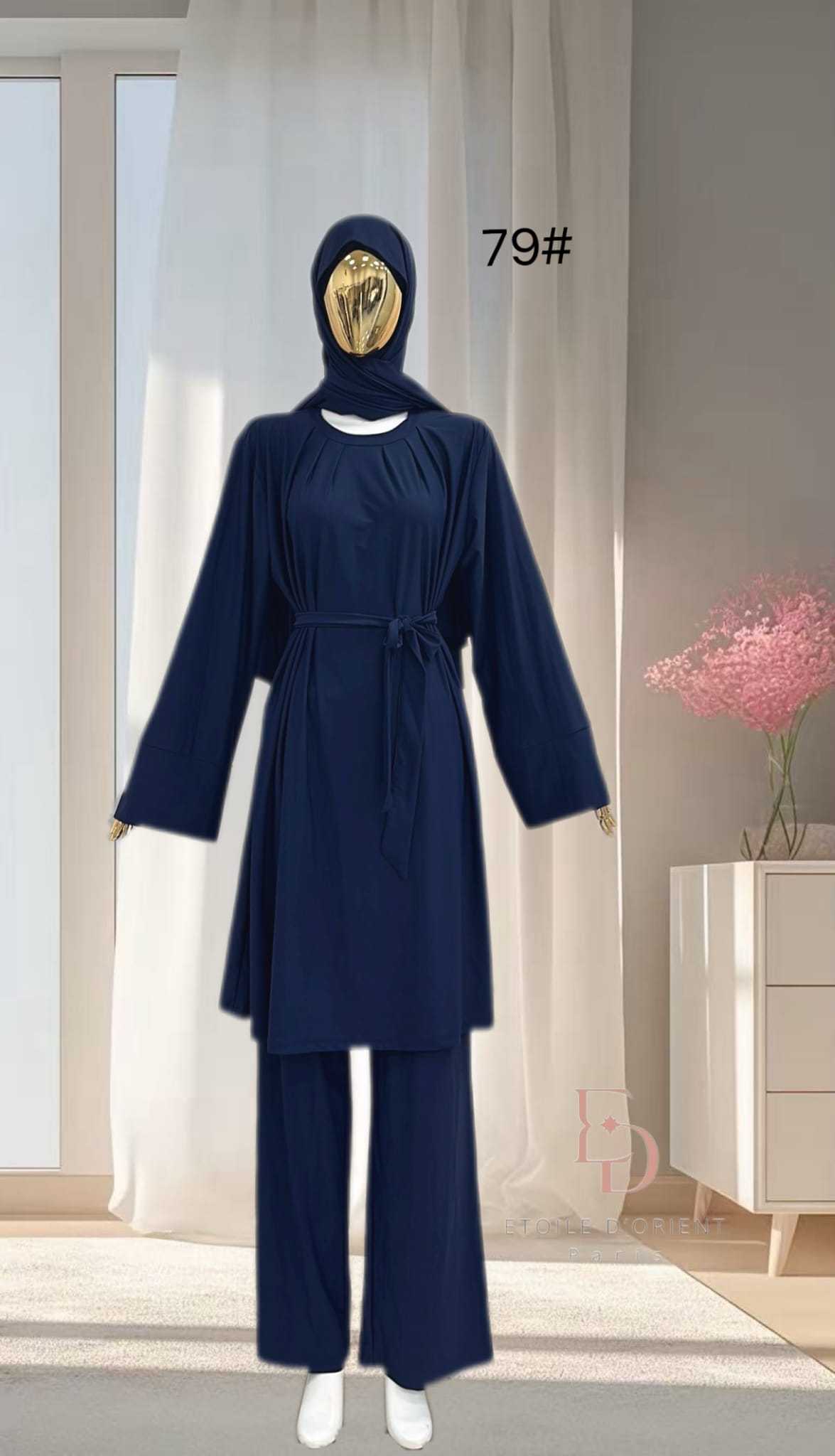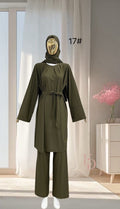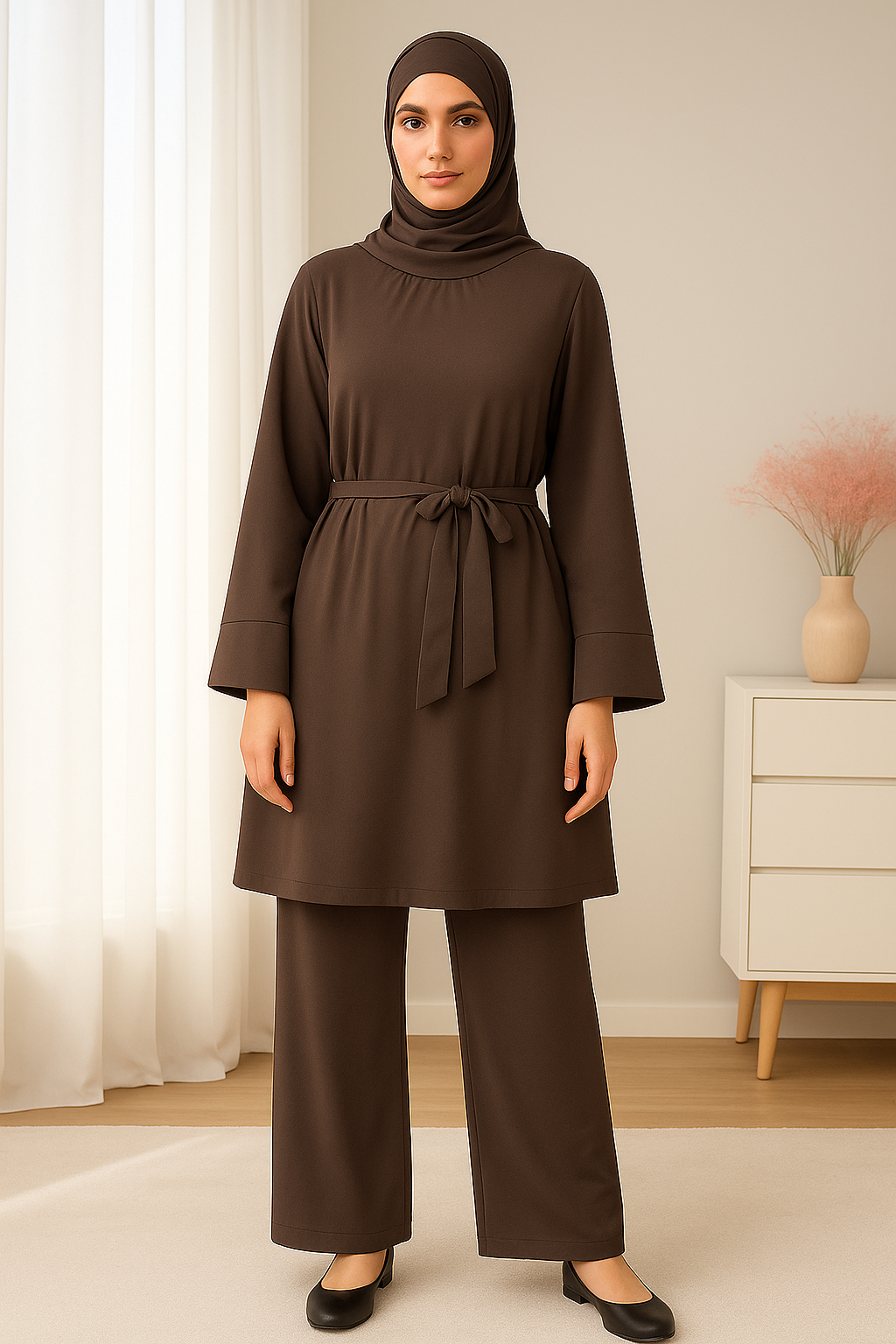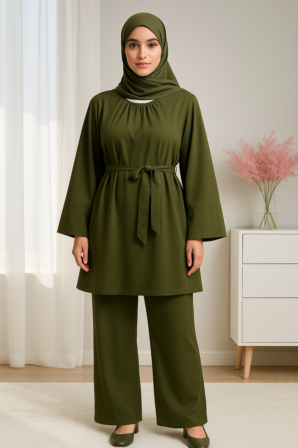 De losvallende tuniek heeft een ronde halslijn en elegante plooien bij de borst, met een strikceintuur voor een vrouwelijke pasvorm. De wijde broek en lange mouwen zorgen voor optimale bedekking zonder in te leveren op stijl.